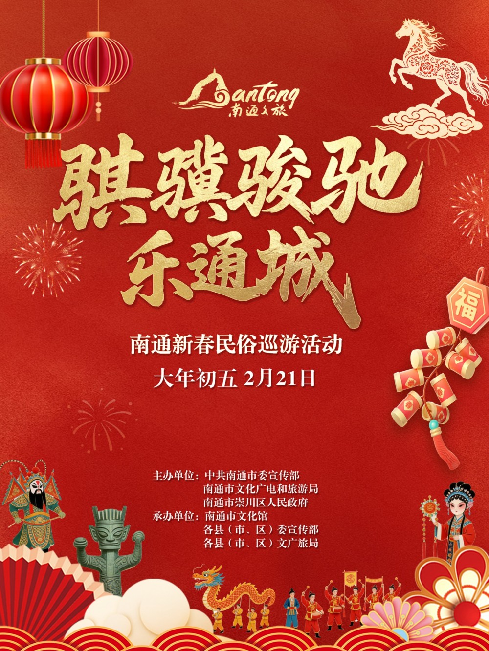 春节是中华文化最古老、最重要的传统节日。为积极响应国家关于传承和弘扬中华优秀传统文化的号召,进一步挖掘和展示我市深厚的文化底蕴,提升城市文化品位和影响力,我市拟举办“骐骥骏驰乐通城”南通新春民俗巡游活动。